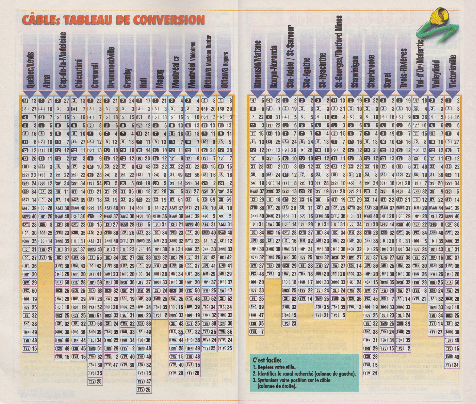 TV Hebdo Édition Nationale August 31 1996 TV Hebdo Édition Nationale Postes inscrits dans la section horaire TV Hebdo Édition Nationale Câble: Tableau de Conversion